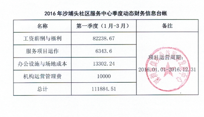 沙埔头社区服务中心2016年第一季度财务动态信息公示
