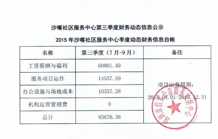 沙嘴社区服务中心2015年第三季度财务动态信息公示