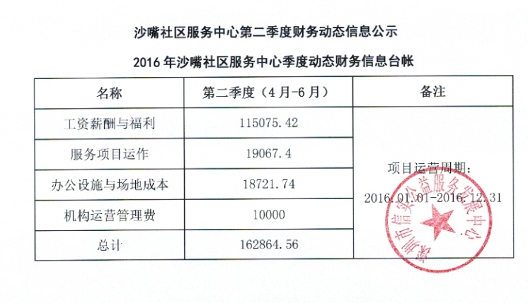 沙嘴社区服务中心2016年第二季度财务动态信息公示