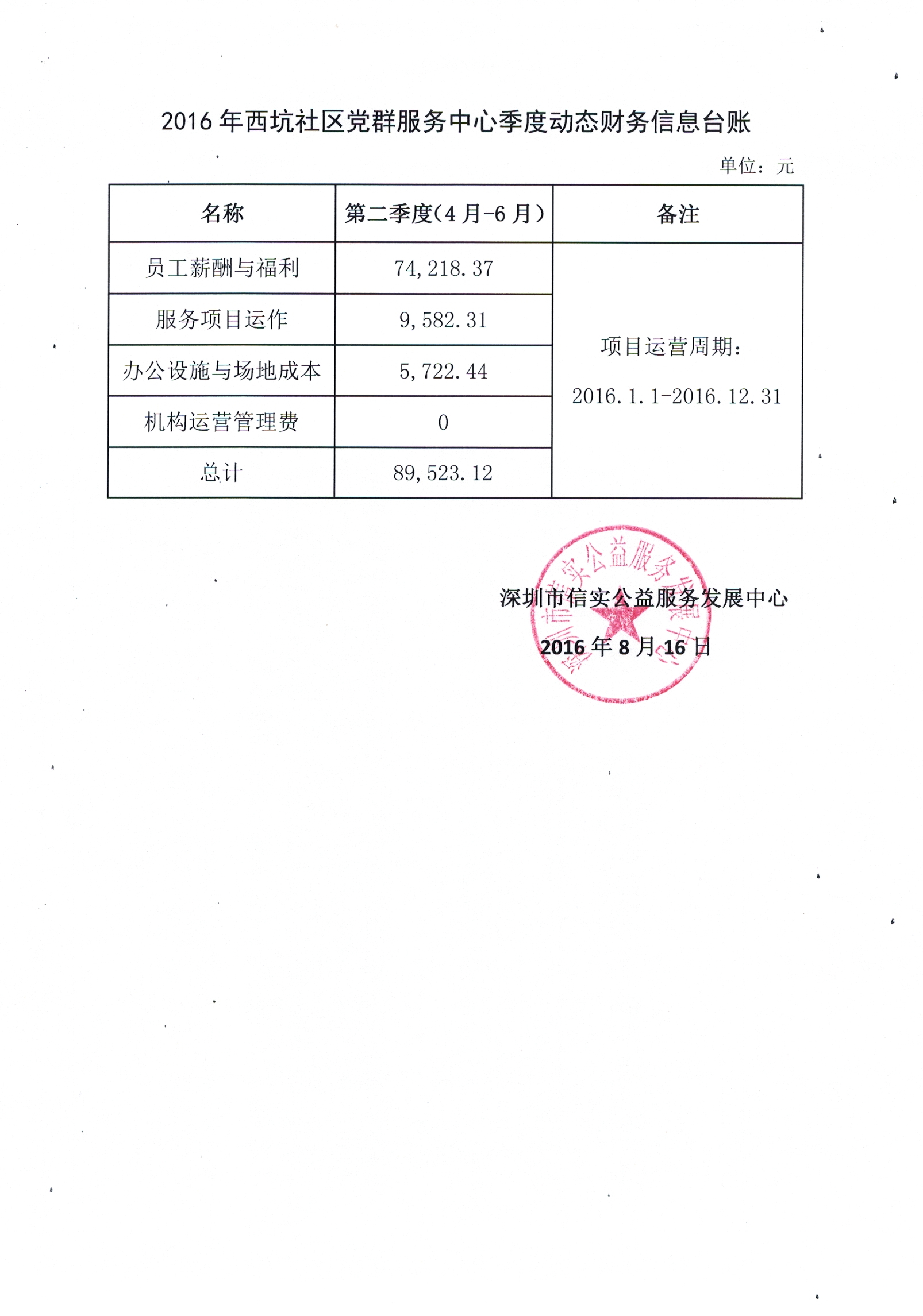 2016年西坑社区党群服务中心第2季度动态财务信息台账