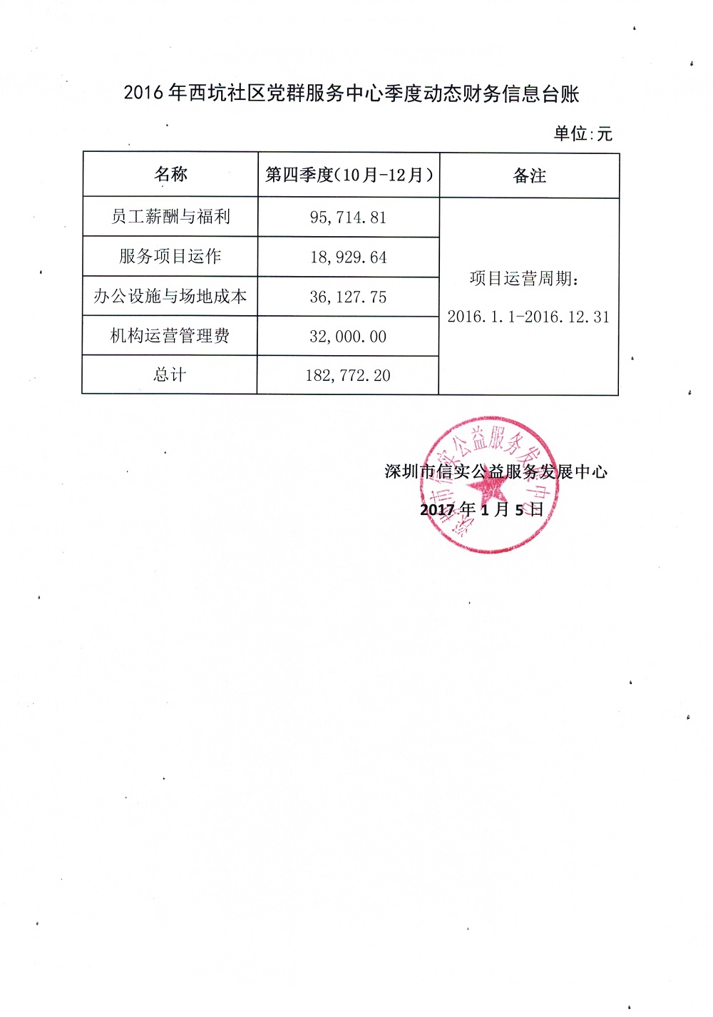 2016年西坑社区党群服务中心第4季度动态财务信息台账