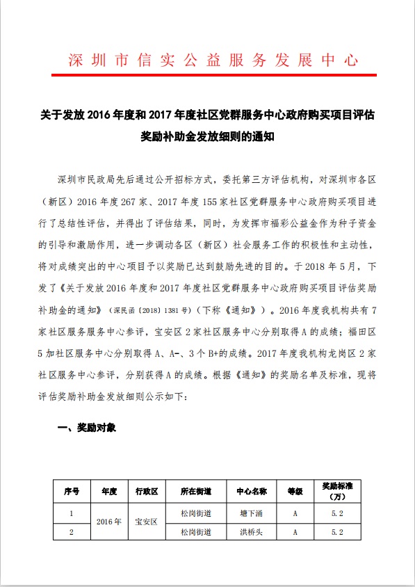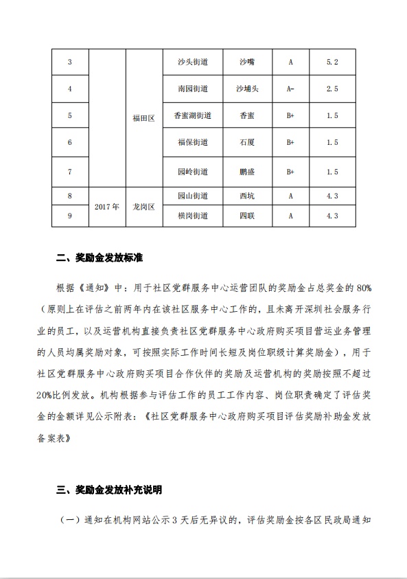 关于发放2016年度和2017年度社区党群服务中心政府购买项目评估奖励补助金发放细则的通知