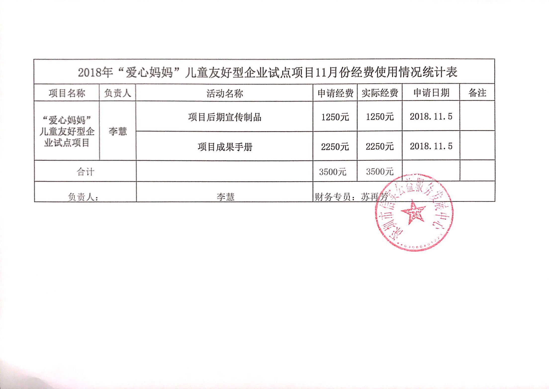 【财务公示】塘尾社区“爱心妈妈小屋”儿童友好型社区企业试点项目11月份经费支出表