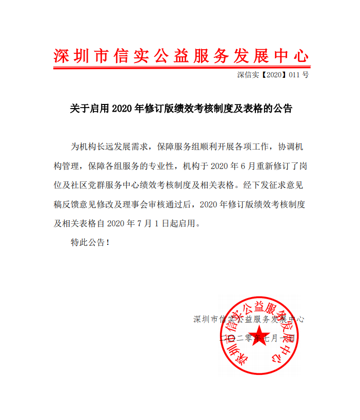 关于启用2020修订版绩效考核制度及表格的公告 深信实【2020】011号 -