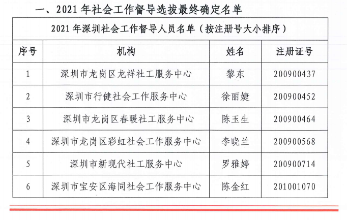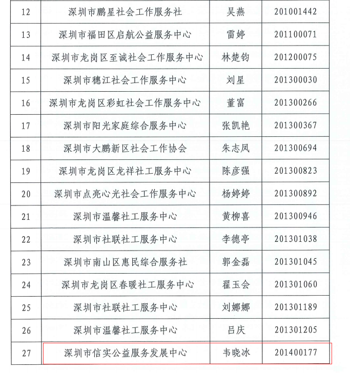 为了加强本土社会工作职业化,专业化发展,深圳市社会工作者协会根据业务指导部门及相关文件要求,组织并完成了2021年社会工作督导选拔工作,经对101名参选人员资格审查、笔试、面试、拟任人员公示等环节,确定了我市2021年新晋社会工作督导人选63名。深圳市信实公益服务发展中心社工韦晓冰成功晋升为深圳市2021年社会工作督导。
