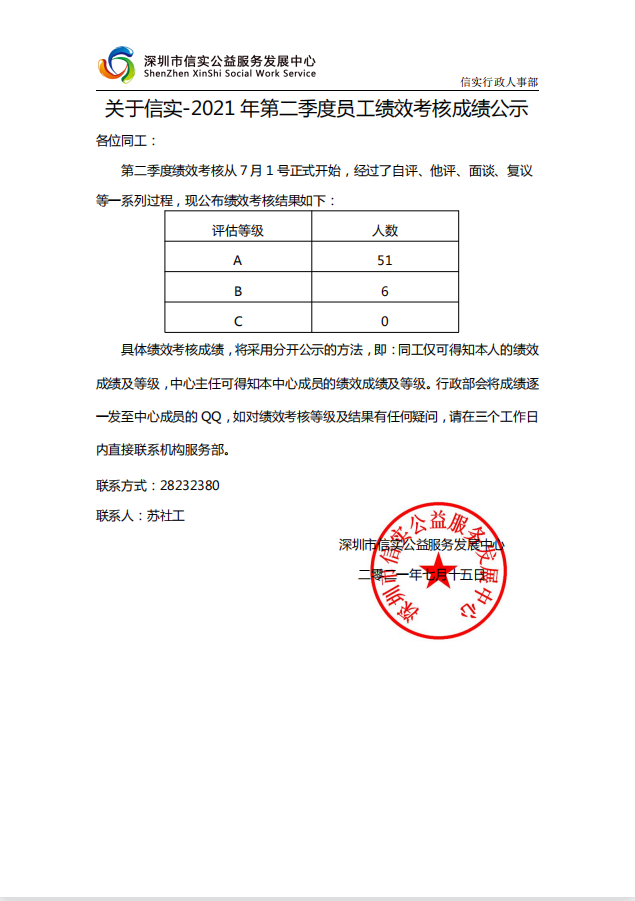 2021年第二季度员工绩效考核结果公示