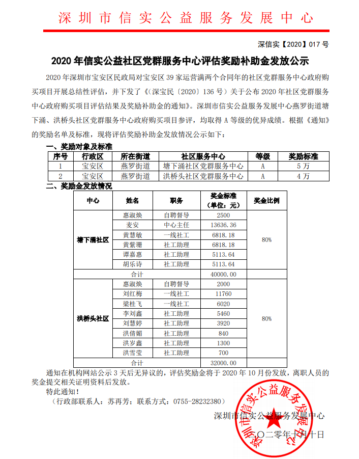 2020年信息公益社区党群服务中心评估奖励补助金发放公示
