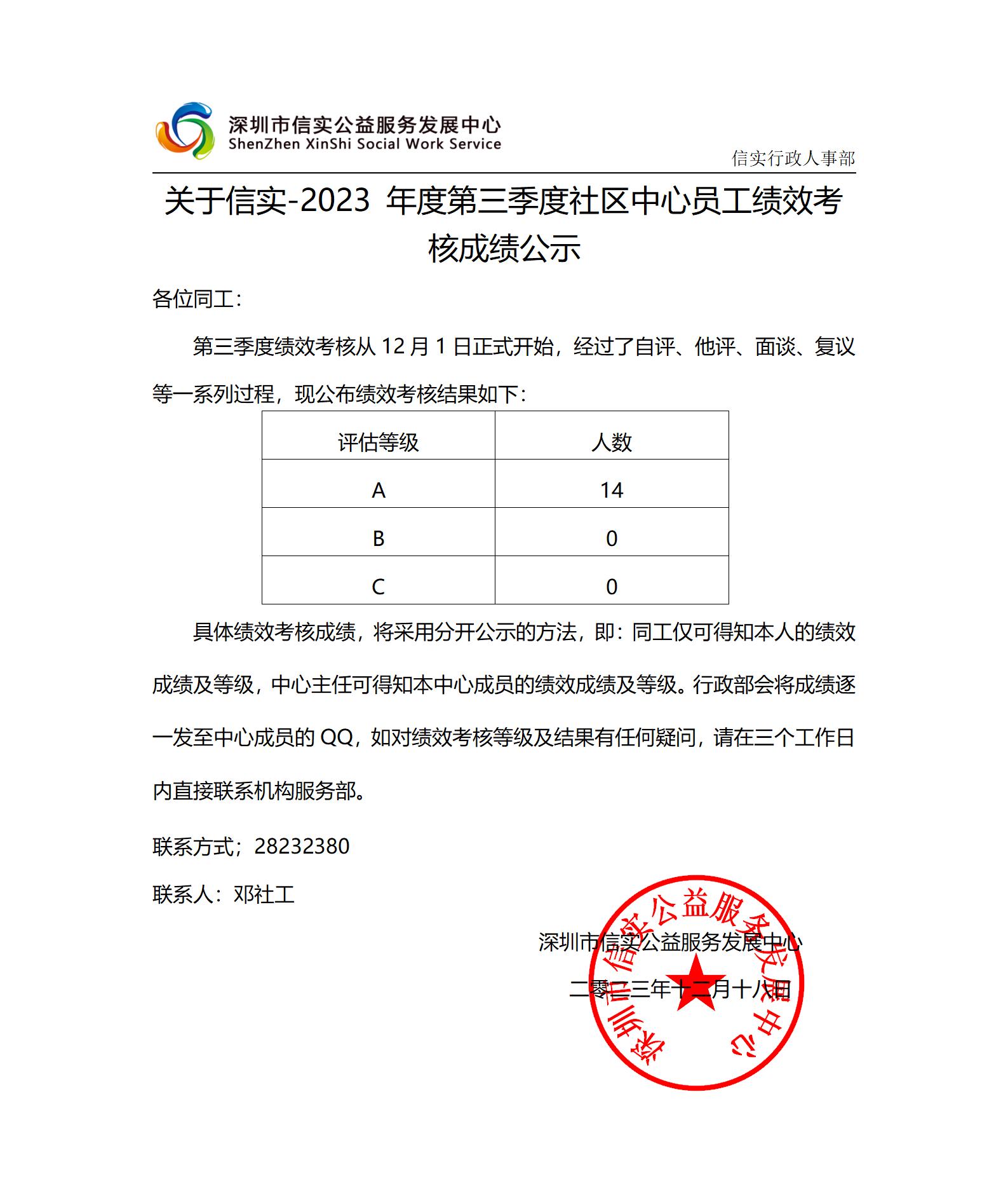 关于信实-2023 年度第三季度社区中心员工绩效考核成绩公示