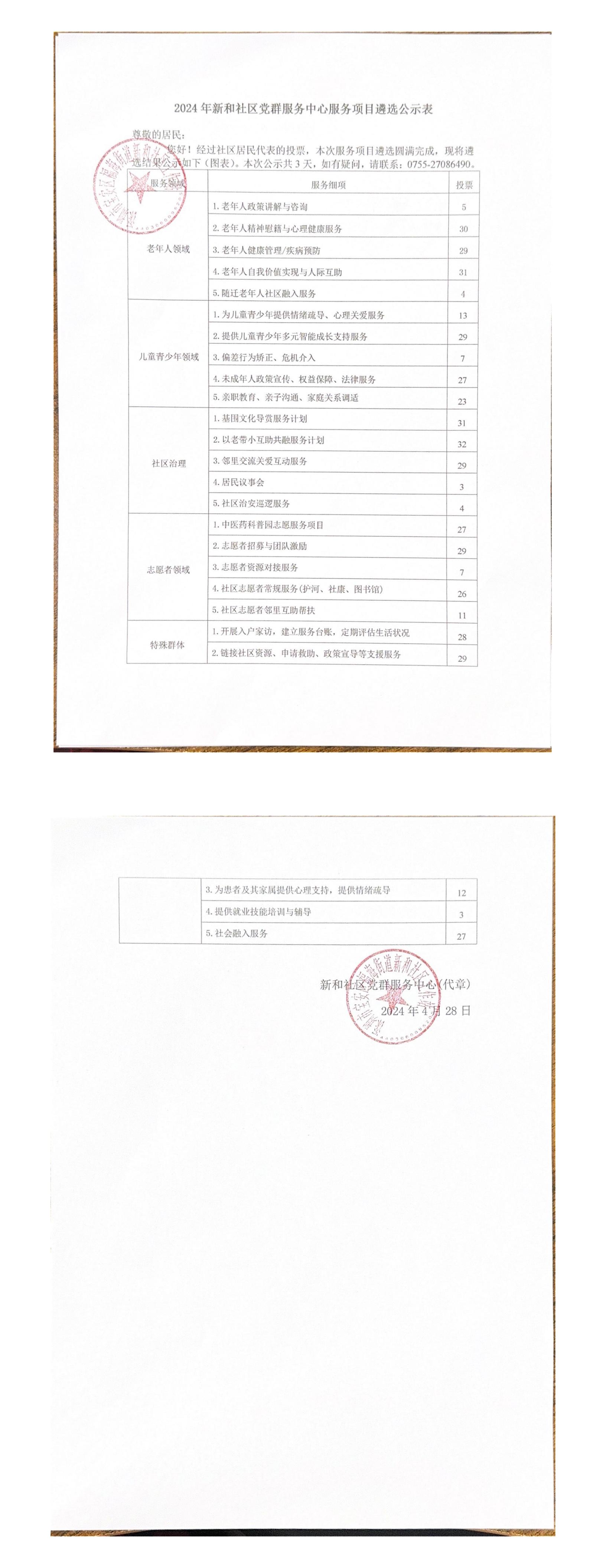 2024 年新和社区党群服务中心服务项目遴选公示表