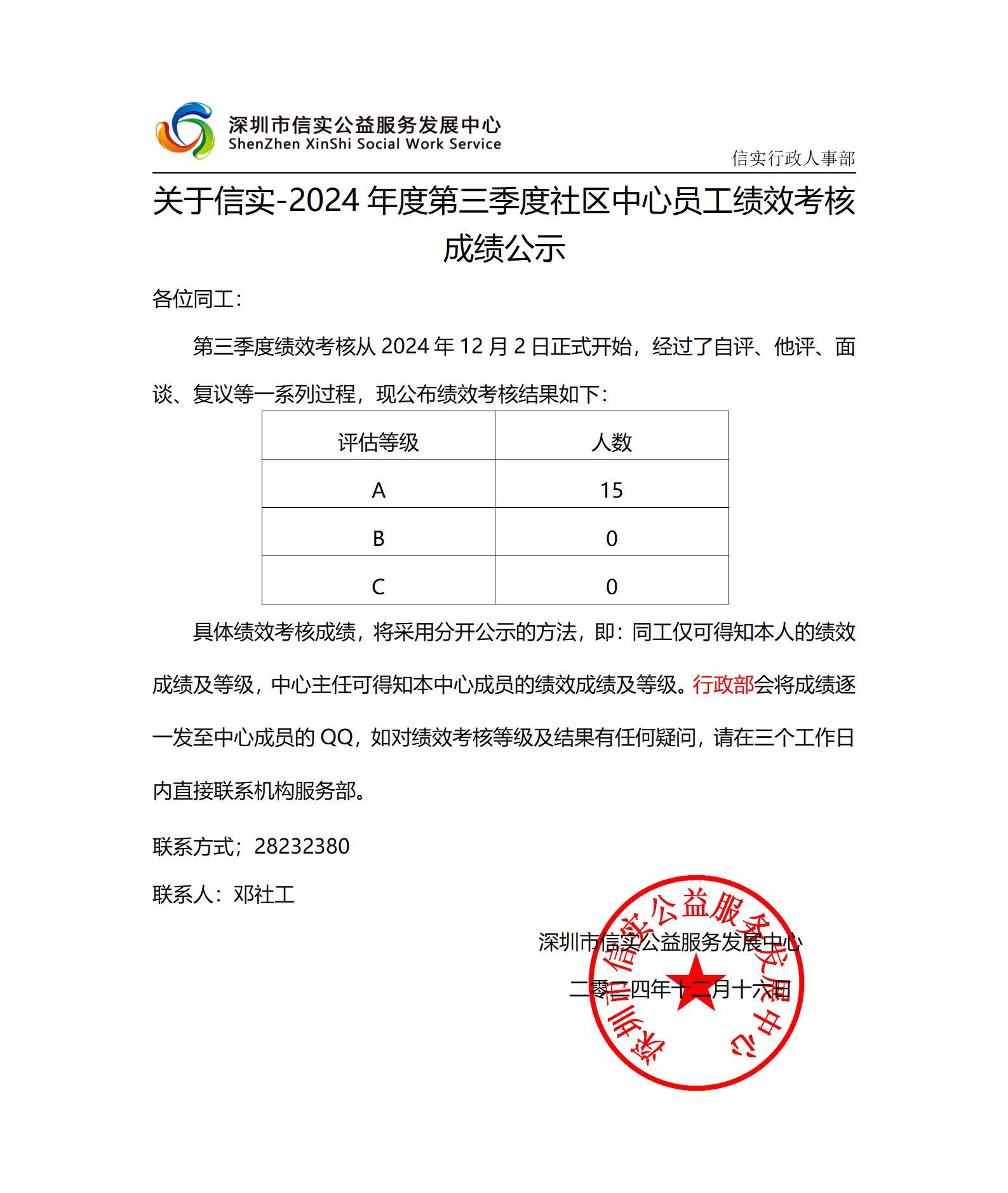 关于信实-2024 年度第三季度社区中心员工绩效考核成绩公示