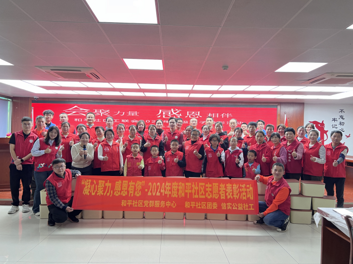为弘扬 “奉献、友爱、互助、进步” 的志愿精神,树立先进典范,增强志愿者的团队凝聚力与社区居民对志愿服务的认同感,在和平社区党委的大力支持下,信实公益社工与和平社区团委、工联会进行联动,于 12 月 29 日下午举办了 “凝心聚力,感恩有您”——和平社区2024 年度志愿者表彰活动。此次活动旨在表彰志愿者们在过去一年中的无私奉献与团结合作,激励更多社区居民投身志愿服务事业。